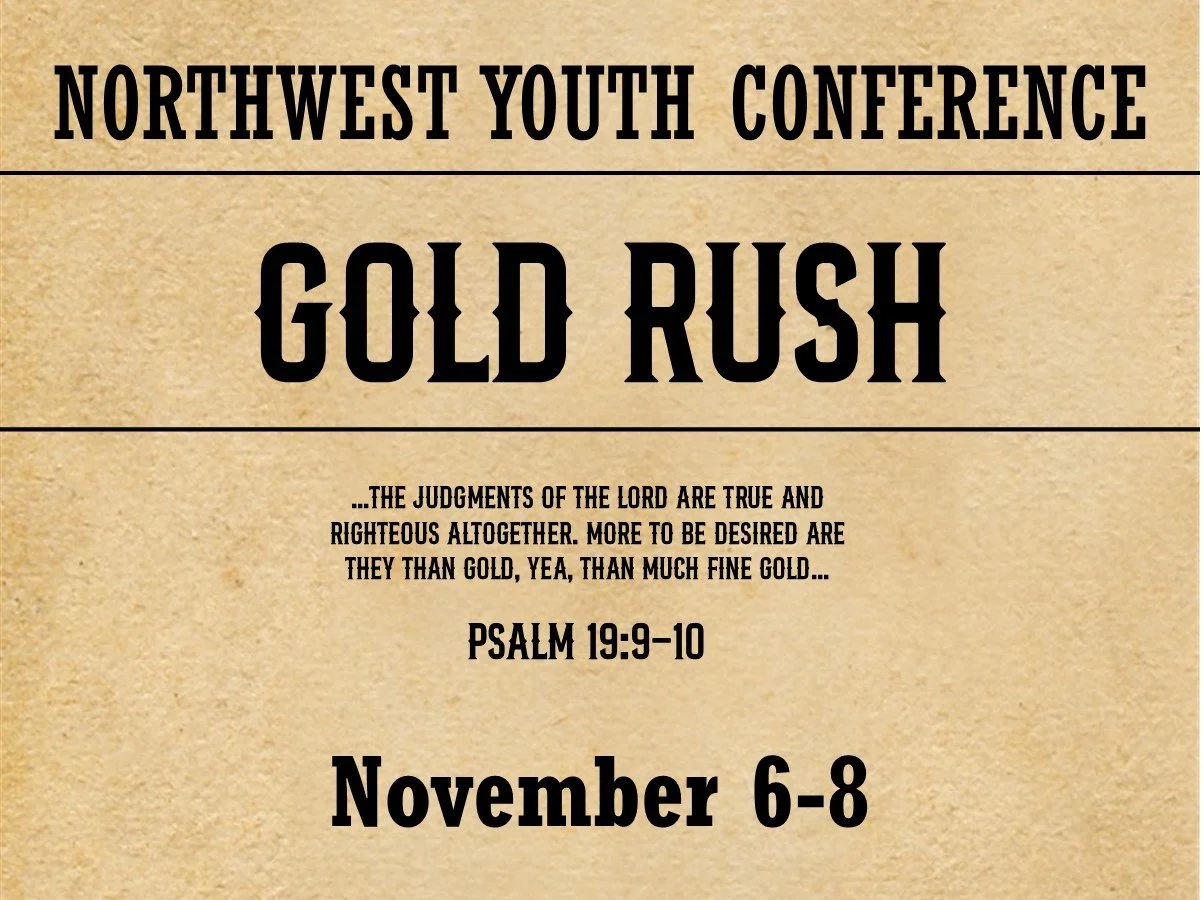 The 2025 Northwest Youth Conference is coming, November 6-8, 2025! It is going to be a great conference with powerful preaching! The theme for our conference this year is “Gold Rush” taken from Psalm 19:9-10 which says, “… The Judgments of the Lord are true and righteous. More to be desired are they than gold, yea, than much find gold…” The Word of God is precious. In a time where it is being questioned and doubted, we must stand boldly on God’s Word.